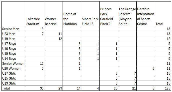 Again note, this doesn’t factor training venues, miniroos games, nor the unique staging of the NPL Boys season which is split into two halves – meaning about 20 home games are yet to be fixtured.