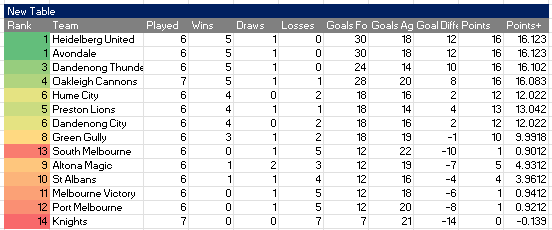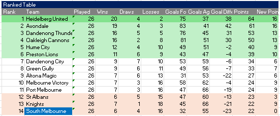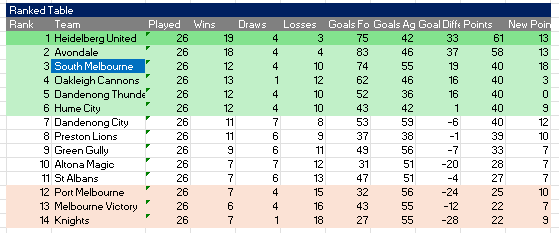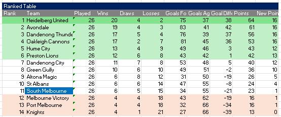 However, our model also assumes that South Melbourne only picks up one point in the next few week. When you consider the recent results against Preston and Hume it is reasonable to think we can actually pick up more points (especially against Altona, Gully and Dandenong City).