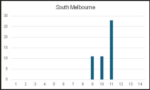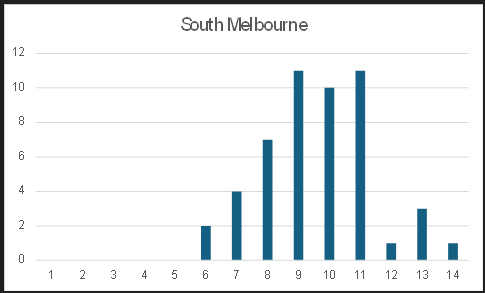 As you can see below in most cases South finished between 9th and 11th. It suggests that finals football is pretty much out of the question, and although relegation occurs less often, it is still possible for South to get relegated.