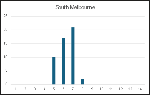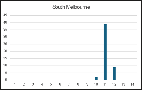 The second, where South lose every game for the season & all other results are random. We ran this case 50 times and we learnt that in only a few cases South gets relegated. Being a stress head I still won’t be comfortable until we are mathematically safe, however it does go to show what an absolute shit show the next few weeks would need to be for us to get relegated. We would need two of Altona, Knights, Port or Victory to somehow catch us on the table. A win against Altona should all but secure safety, a loss… and things could change quickly yet again.